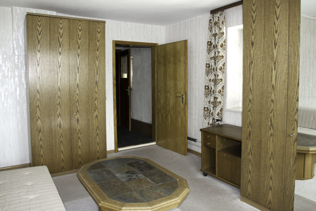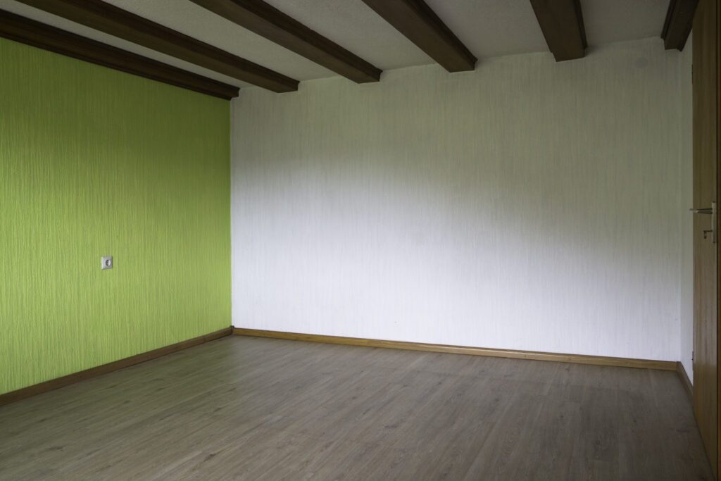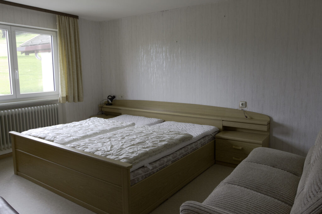 Von der Küche aus gelangt man über eine kleine Holztreppe in den ersten Stock. Dort befinden sich drei Schlafzimmer. Da das Haus am Hang gebaut ist, befinden sich hier auch der Zugang zur Scheune und ein Zugang von der Garage aus.