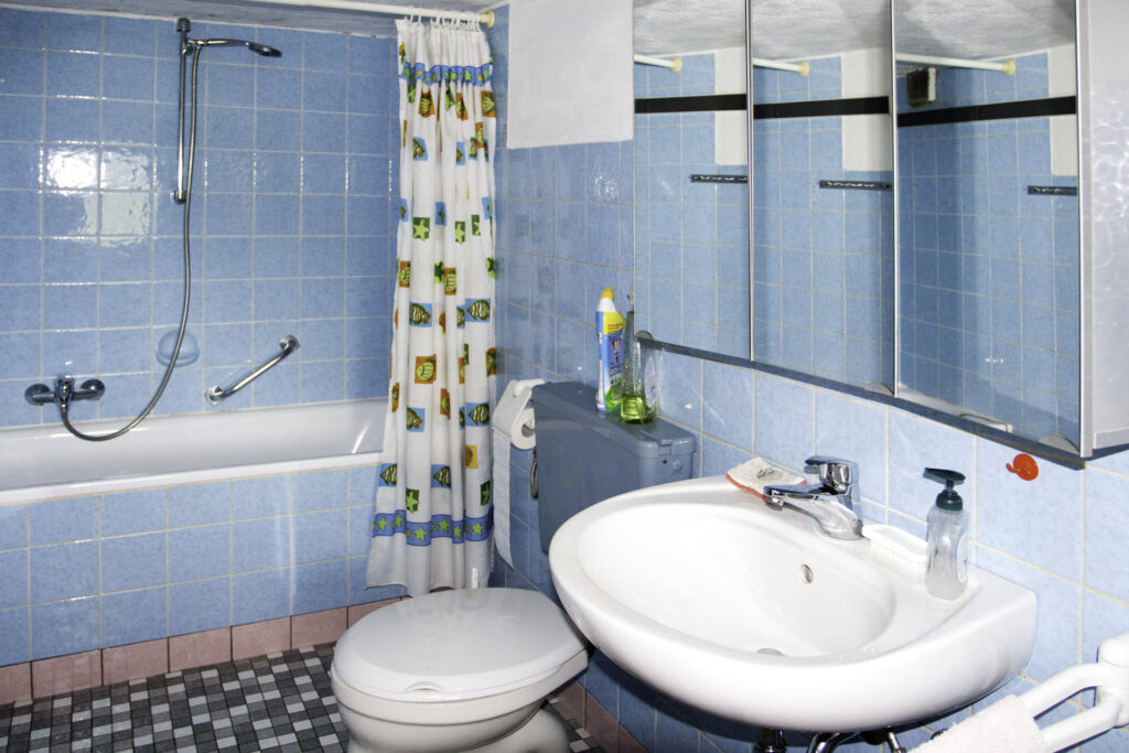 Ebenfalls im Erdgeschoss befindet sich ein kleiner Abstellraum, das Gäste-WC sowie das Bad mit Badewanne und Waschmaschinenanschluss. Hier ist auch ein Zugang zum ehemaligen Stall, der ebenfalls als Abstellraum genutzt werden kann. Auch das Wohnzimmer mit direktem Zugang zur 40 m² großen Terrasse und das Schlafzimmer sind im Erdgeschoss.